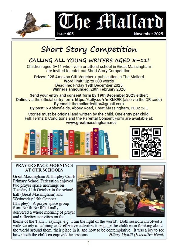 "THE MALLARD" is published every month and distributed free to the residents of Great and Little Massingham with the support of the Great Massingham Parish Council, the Parochial Church Council and Massingham Village Hall Committee. It includes news stories, notices, forthcoming events, church services, advertising for local businesses, and anything else that is felt to be of interest to Massingham residents.