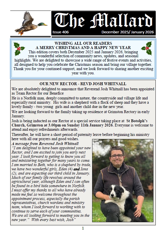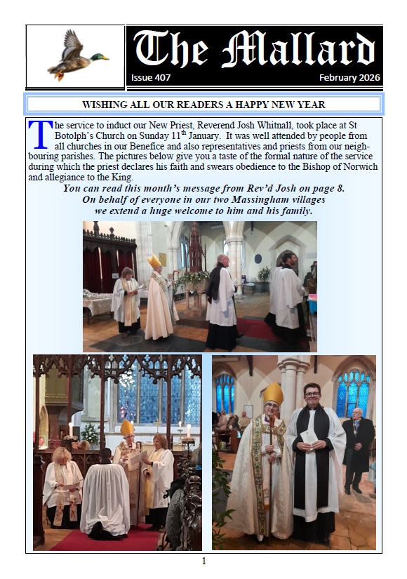 "THE MALLARD" is published every month and distributed free to the residents of Great and Little Massingham with the support of the Great Massingham Parish Council, the Parochial Church Council and Massingham Village Hall Committee. It includes news stories, notices, forthcoming events, church services, advertising for local businesses, and anything else that is felt to be of interest to Massingham residents.