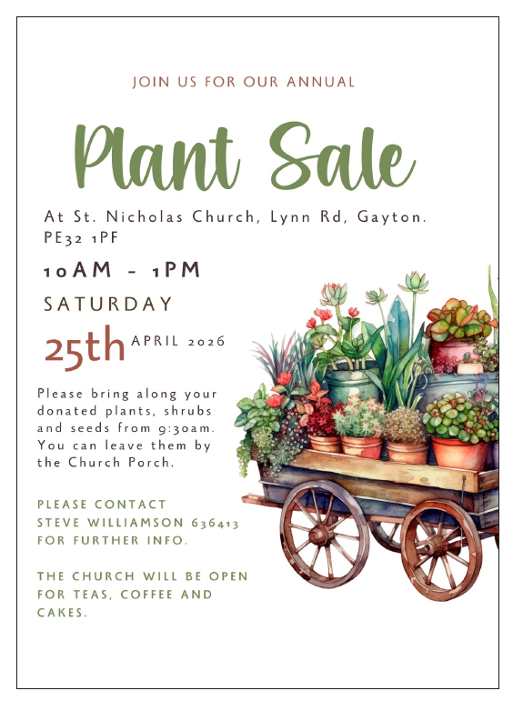 Please bring along your donated plants, shrubs and seeds from 9.30 am. You can leave them by the Church porch. The sale starts at 10.00 am and there will be coffee, tea and cakes available.