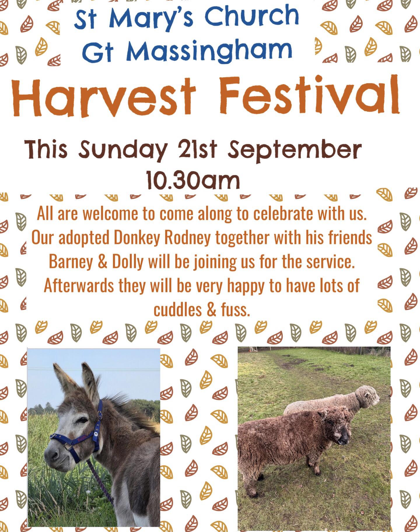 Our adopted donkey, Rodney, together with his friends. Barney and Dolly, will be joining us for the service.