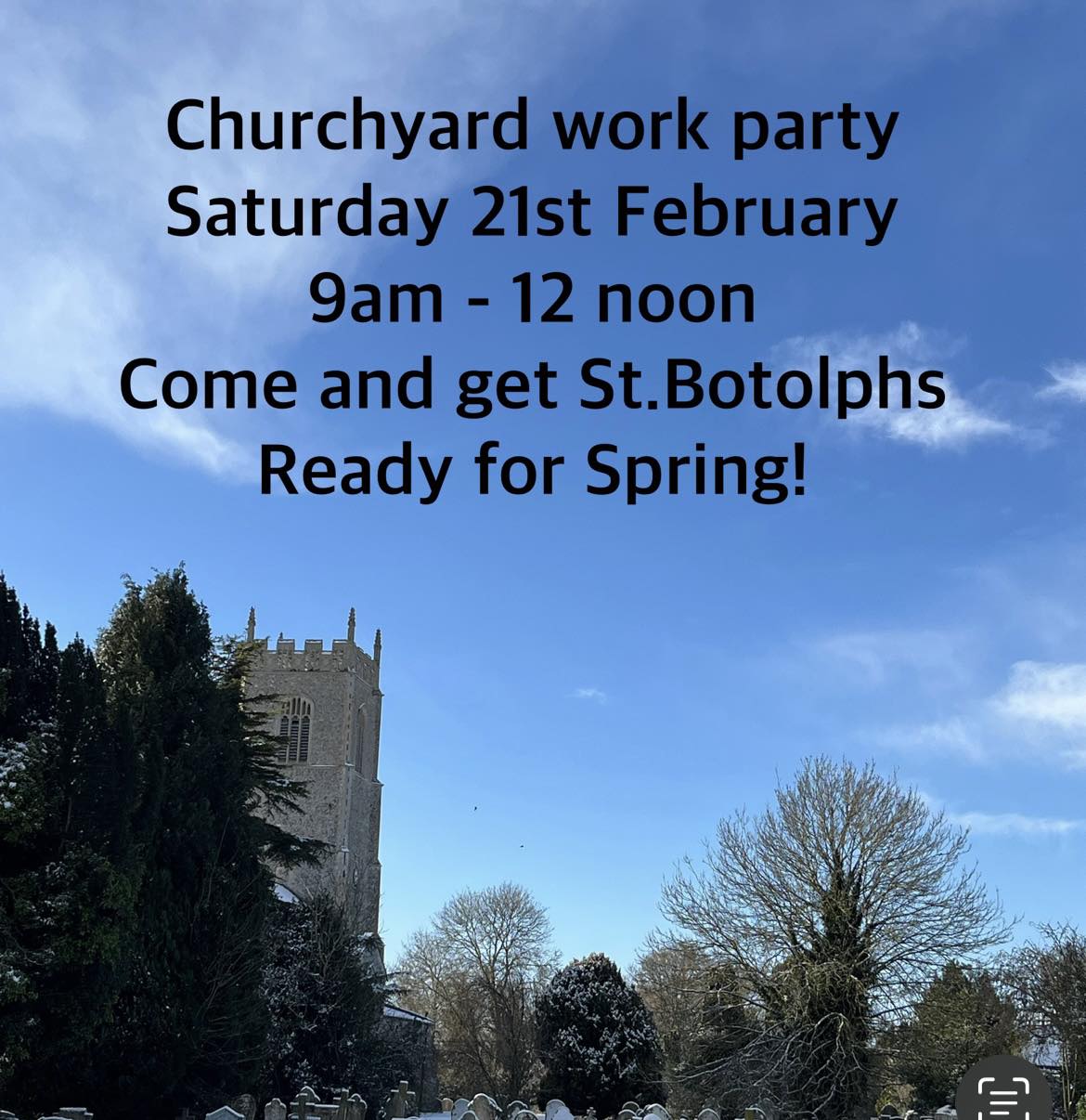 Please come along when you can, for as long as you can and join in to get St.Botolphs churchyard ready for Spring. FOSB fabulous refreshments at 1/2 time. Jobs to do… Low level pollarding of Lime trees Thinning trees in churchyard Clearing leaves and debris Cleaning low level gutters and down pipes Tidying graves Cleaning & tidying remembrance stones Cutting back ivy Weeding the path Rabbit proofing Cleaning/checking bird boxes Clearing mole hills Locating hedgehog houses Bits to Bring… Garden tools Wheelbarrow Bucket Secateurs Gloves Your energy and enthusiasm Whatever else you think will be useful … Look forward to seeing you there!