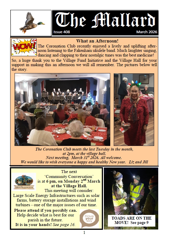 "THE MALLARD" is published every month and distributed free to the residents of Great and Little Massingham with the support of the Great Massingham Parish Council, the Parochial Church Council and Massingham Village Hall Committee. It includes news stories, notices, forthcoming events, church services, advertising for local businesses, and anything else that is felt to be of interest to Massingham residents.